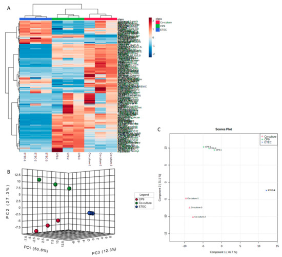 Metabolic repertoire of emergent features in CP9 and ETEC co-culture. (A) Heat map of successful annotated compounds showing significant clustering patterns between mono and co-culture of CP9 and ETEC; (B) 3D score plot of PCA model of variance and (C) Score plot of PLS-DA model of variance showing clear separation between mono and co-culture metabolomic profiles of CP9 and ETEC. Detail list of the metabolites are provided in Supplementary Table S2. Statistical analysis was performed using MetaboAnalyst software v4.036, ANOVA testing with Fisher’s post hoc analysis plus false discovery rate (FDR) analysis. Features with p < 0.05 plus fold change of >2 were considered significant.