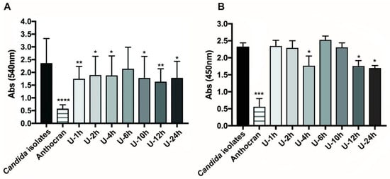 Activity of Anthocran® (0.1 mg/mL), and urinary fractions against ten C. albicans clinical isolate biofilms (black bar). Bar graphs show the mean absorbance of all the clinical isolates and error bars are standard deviations. (A) Crystal violet assay was used to evaluate biofilm biomass reduction. (B) XTT assay was used to measure reduction in biofilm metabolic activity. Data from three independent experiments are reported. Significant differences are indicated by * p < 0.05, ** p < 0.01, *** p < 0.001, **** p < 0.0001, Mann–Whitney U test.