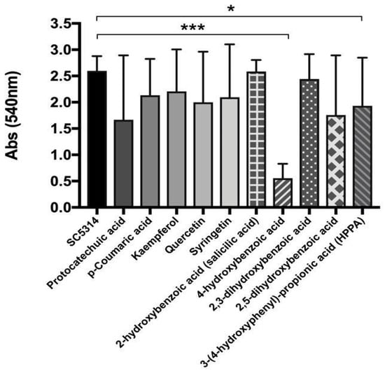 Activity of metabolites (10 μM) identified by targeted MS analysis on C. albicans SC5314. Crystal violet assay was used to evaluate biofilm biomass reduction. Bars represent the mean values (± SD) of three independent experiments. Significant differences are indicated by * p < 0.05, *** p < 0.001, Mann–Whitney U test.