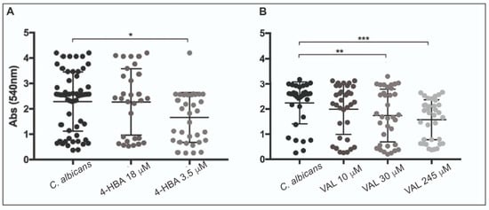 Inhibition of C. albicans clinical isolates biofilm formation in the presence of a different concentration of (A) 4-hydroxybenzoic acid (4-HBA) and (B) 5-(3′,4′-dihydroxyphenyl)-γ-valerolactone (VAL). The results are shown as a scatter plot, where horizontal bars indicate mean and vertical bars standard deviation. Significant differences are indicated by * p < 0.05, ** p < 0.01, *** p < 0.001, Mann–Whitney U test.