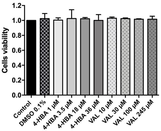 VAL and 4-HBA cytotoxicity was assessed by 3-(4,5-dimethylthiazol-2-yl)-2,5-diphenyl tetrazolium bromide (MTT) assay on colorectal adenocarcinoma cell line Caco-2 (ATCC® HTB-37™, ATCC, Manassas, VA, USA). Compounds’ stock solutions were prepared in dimethyl sulfoxide (DMSO), diluted in complete medium (Dulbecco’s modified Eagle’s medium supplemented with 10% fetal bovine serum, 2 mM L-glutamine, and 1 mM sodium pyruvate) and filtered on 0.22 µm filters. The concentrations tested were 245, 100, 30, 10 µM for VAL and 36, 18, 3.5, 1 µM for 4-HBA. DMSO 0.1% (the highest concentration in the dilutions) was added as control. Briefly, 1 × 104 Caco-2 cells/well were seeded in a 96-well plate and treated with serial dilutions of VAL and 4-HBA for 24 h. The MTT solution (0.5 mg/mL) was then added to each well and incubated for 3–4 h. Formazan crystals were solubilized with 100 µL/well of lysis buffer (8 mM HCl and 0.5% NP-40 in DMSO) and the absorbance measured at 575 nm in a microplate reader (Power Wave HT, Biotek, Bad Friedrichshall, Germany). The cell viability was calculated by the following formula: