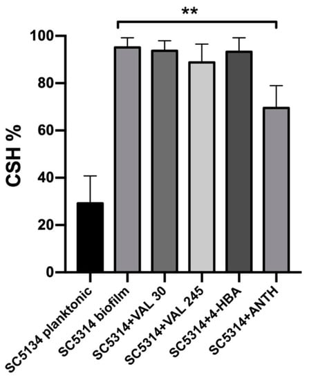 Cell surface hydrophobicity (CSH) is not altered by 4-HBA (3.5 μM) and VAL (30 and 245 μM) alone, whereas Anthocran® 0.1 mg/mL significantly affects the yeast surface hydrophobicity. Data represented the mean ± SD of three independent experiments. Data sets were compared by one-way ANOVA, ** p < 0.01.