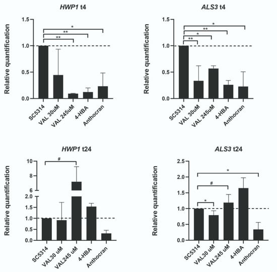 We then evaluated the expression of genes encoding for proteins that are involved in the initial phases of C. albicans biofilm formation. In particular, we studied the expression of HWP1 and ALS3 genes, which are both involved in adhesion and filamentation. As shown in Figure 7, 4 h after biofilm induction, both genes were downregulated in C. albicans SC5314 treated with VAL and with 4-HBA (also by Anthocran® itself), compared to the controls. At 24 h, the downregulation in HWP1 and ALS3 gene expression was not observed, which is in line with the reported involvement of both transcripts in the early phases of biofilm formation.