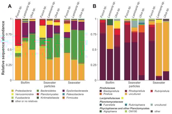 At the phylum level (Figure 1A), Laminaria sp. and Ulva sp. communities were rather similar despite the distant relation of the two host organisms. Both were dominated by Proteobacteria (63.2% and 49.7%, respectively). Two other major taxa were the Bacteroidetes (6.5% and 26.3%) and Epsilonbacteraeota (24.2% and 20.5%). Other lineages, including Verrucomicrobia, Planctomycetes, Patescibacteria (Candidate Phyla Radiation), Fusobacteria, Kiritimatiellaeota, and Firmicutes, were present, but each constituted <1.8% of the biofilms. In comparison with the Laminaria sp. and Ulva sp.-associated communities, the general composition of the surrounding particles and planktonic bacteria only changed slightly (Figure 1A): while the Bacteroidetes gained dominance over the Proteobacteria, Verrucomicrobia and Planctomycetes also became more prominent. In recent years, Ulva sp. biofilms have been analyzed in particular and were often shown to be primarily composed of Alphaproteobacteria and Bacteroidetes, often followed by Gammaproteobacteria, Actinobacteria, Firmicutes, Cyanobacteria, Verrucomicrobia, and Planctomycetes [8,10,12,14,15,16]. Our results are mostly consistent with these results, with exception to the high abundance of Epsilonbacteraeota and the absence of considerable amounts of Actinobacteria and Cyanobacteria. The identification of taxa such as Patescibacteria and Kiritimatiellaeota might be explained by the only recent work that was dedicated towards these clades and now enables their detection [90,91,92]. In contrast to other studies [10,16], the dominant Proteobacteria were not Alphaproteobacteria, but Gammaproteobacteria, which constituted between 78.7% and 90.3% of the total Proteobacteria and primarily included Alteromonadales (81.3% of Gammaproteobacteria on Laminaria sp.) or Thiotrichales (42.6% of Gammaproteobacteria on Ulva sp.), followed by Oceanospirillales and Vibrionales. Interestingly, Gammaproteobacteria, in particular taxa of the orders Alteromonadales and Oceanospirillales, were found to be highly abundant in young marine biofilms [93] and might be used as an indicator for the age of the examined biofilms.
