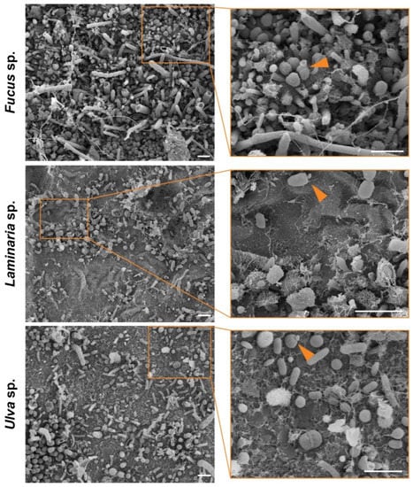 In a second step, the algae samples were analyzed by field emission scanning electron microscopy (FESEM) to determine the different morphologies of the algae-associated surface biofilms. Figure 2 shows the biofilm composition of the sampled Fucus sp., Laminaria sp., and Ulva sp. specimens. Fucus biofilms were by far the densest, with less than 5% algal surface visible in all FESEM images (n = 16; visual inspection and estimation). While most bacteria appear spherical or rod-shaped with one pole thicker than the other, chains of coccoid cells and tubular-like microorganisms were also visible. In comparison, biofilms of Laminaria sp. and Ulva sp. were less dense and more non-colonized areas were visible. Laminaria sp. biofilms were dominated by rod-shaped bacteria, with about 25–50% of the algal surface lacking microbial epibionts (n = 16). Biofilms of the Ulva sp. surface showed a very similar degree of colonization as the Laminaria sp. samples, while more chain-forming microorganisms were present, and the diversity of bacterial morphologies seemed less broad. A lot of spherical cells with evenly distributed fibers around the whole cell body were visible. While the majority of the microorganisms found on all macroalgae seemed to be dividing by binary fission, budding bacteria could also be spotted on all algal samples (Figure 2, orange arrowheads). However, it is uncertain if these cells belong to members of the class Planctomycetia found in all epiphytic communities or if they are members of other budding species. The latter might also be the case since between 1.3% and 1.7% of the found OTUs are derived from non-planctomycetal, but budding bacteria, such as members of the Hyphomonadaceae, Rhodobacteraceae, or Alteromonadaceae. Nevertheless, the abundance of Planctomycetes was 0.5–14-fold higher than those of the other budding bacteria, making them an excellent target for further investigation.