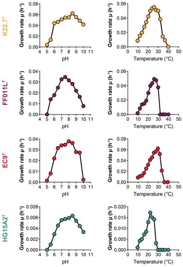 Temperature and pH optima of strains K22.7T, FF011LT, EC9T and HG15A2T. Growth was determined by optical density measurements at 600 nm and growth rates were calculated for cultures during the exponential phase. Each dot represents the mean of duplicate measurements.