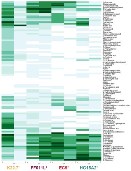 Heatmap of substrate utilization patterns of strains K22.7T, FF011LT, EC9T and HG15A2T. Two biological replicates were performed using the MicroLog GN2 substrate plates. Color scale shows substrate usage in percent utilization (white: 0%, dark green: 100%).