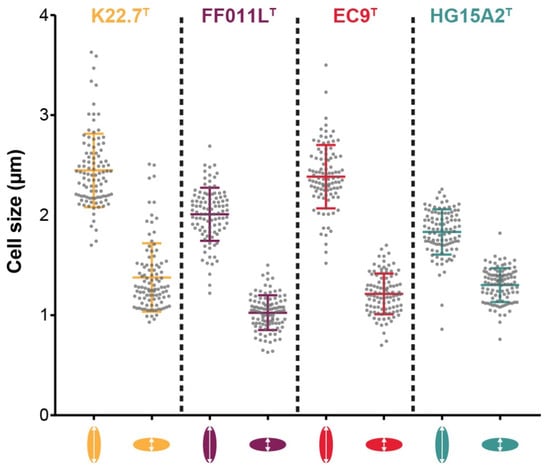 Cell sizes of the isolated planctomycetal strains K22.7T, FF011LT, EC9T and HG15A2T. Average cell size of all strains was investigated by light microscopy and under phase-contrast illumination. Cell size was determined by measuring 100 individual cells per strain. Each dot represents one measurement and median and standard deviation values are indicated.