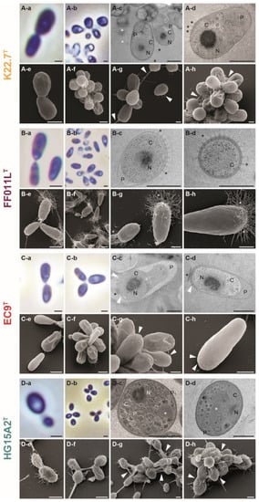 For investigation of the cellular morphology and cell size of strains K22.7T, FF011LT, EC9T, and HG15A2T (Figure 6), we performed light, scanning, and transmission electron microscopy (Figure 7). Strain K22.7T was 2.5 ± 0.4 µm in length and 1.4 ± 0.3 µm in width. Strain FF011LT was smaller, measuring 2.0 ± 0.3 µm in length and 1.0 ± 0.2 µm in width. With its elongated cell bodies, cells of strain EC9T measured 2.4 ± 0.3 µm in length and 1.2 ± 0.2 µm in width. The smallest of the novel strains was HG15A2T, measuring 1.8 ± 0.2 in length and 1.3 ± 0.2 µm in width (Figure 6, Table 1). This smallest of the four strains showed an egg-shaped morphology. It divides by polar budding (Figure 7D). Cells of strain HG15A2T occurred as single cells or aggregates of 3–10 cells (Figure 7D-g,h).