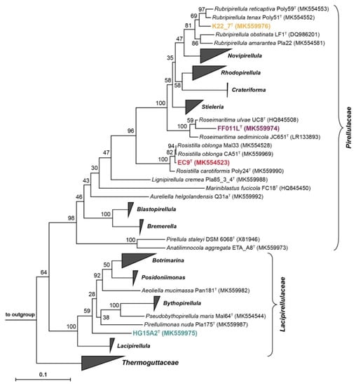 The construction of a genome-based tree from a multilocus sequence analysis (MLSA) as well as a 16S rRNA gene sequence-based phylogenetic tree confirmed the placement of the four novel strains in the order Pirellulales (see Section 3.6, Section 3.7, Section 3.8 and Section 3.9, Figure 8 and Supplementary Figure S1). In this order, strains K22.7T, EC9T and FF011LT appeared to belong to different genera of the family Pirellulaceae, whereas strain HG15A2T was identified as member of the family Lacipirellulaceae.