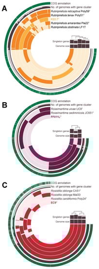 Pan genome of the novel strains in the context of their genera. Each open circle represents the pan genome of all strains but is colored darker when the gene is present in the respective genome. The trees reflect on the relatedness of the strains based on the absence/presence of genes. The outer circles show the number of genomes in which a gene is present and if it has a COG annotation (dark grey) thereby relaying information on how good the genes are annotatable. (A): Strain K22.7T and the genus Rubripirellula. (B): Strain FF011LT and the genus Roseimaritima. (C): Strain EC9T and the genus Rosistilla. Strain HG15A2T was omitted since it is currently the sole member of the novel genus Adhaeretor.