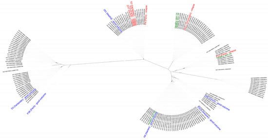 Gene prediction and the annotation of all genomes were performed with PGAP [31]. For phylogenomic analyses, the core genome was identified and aligned with Parsnp, a program which is part of the Harvest software package [32]. A total of 150 C. acnes genomes stored in GenBank were used, along with the 16 genomes sequenced here to build a core-genome-based phylogeny. The 150 genomes were selected according to their assembly quality (N50 > 500 kb). Reliable core-genome SNPs identified by Parsnp were used for the reconstruction of whole-genome phylogeny. Phylogenetic trees were visualized using the Interactive Tree of Life (iTOL; https://itol.embl.de/, accessed on 15 March 2021). For comparative genome analyses and visualization, the programs ACT [33] and BRIG were used [34]. SLST assignment was performed on http://medbac.dk/slst/pacnes, accessed on 1 March 2021. ResFinder [35] was used to identify (acquired) genes mediating antimicrobial resistance.