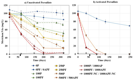 Figure 4 illustrates the change in persulfate concentration over the experimental timeframe. Regardless of the concentration of persulfate added and the amount of Merichem NAs removed, over 320 days at 21 °C, the persulfate proved to be persistent and had approximately half remaining in the system (45.6–61.7%). Sohrabi et al. [59] found persulfate was persistent in OSPW with less than 10% of 10 g/L of persulfate consumed over 111 days.