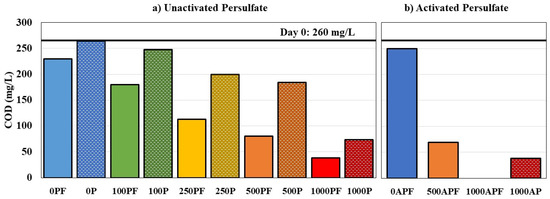 Chemical oxygen demand (COD) for (a) unactivated persulfate bottles at 21 °C on day 310 and (b) activated persulfate bottles at 30 °C on day 240. Note: “P”: unactivated persulfate concentration, “PF”: unactivated persulfate coupled treatment bottles, “AP”: activated persulfate concentration, “APF”: activated persulfate coupled treatment bottles, dashed pattern represents chemical control bottles. Data points represent a single microcosm for each condition.