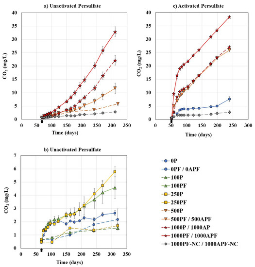 Carbon dioxide concentration in the headspace for (a,b) unactivated persulfate bottles at 21 °C and (c) activated persulfate bottles at 30 °C. Note: “P”: unactivated persulfate concentration, “PF”: unactivated persulfate coupled treatment bottles, “AP”: activated persulfate concentration, “APF”: activated persulfate coupled treatment bottles, “NC”: no carbon controls, P. fluorescens was added to PF bottles after 2 months (