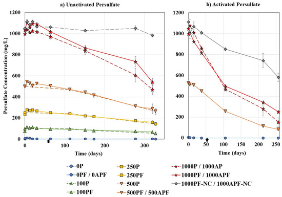 Chemical control bottles and coupled treatment bottles did not show a statistically significant difference in persulfate removal (p > 0.05). The no carbon control (1000PF–NC) was used to demonstrate the decomposition of persulfate in the absence of Merichem NAs and had 88.0 ± 0.9% remaining (982.1 ± 9.6 mg/L) by day 320. It is possible that the persulfate was reacting with the small concentration of organics from the inoculated cells and that there was some level of activation even at 21 °C, causing decomposition of the persulfate anion [78].