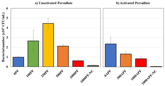 The highest concentration of persulfate tested, 1000 mg/L, exhibited the lowest bacterial number at 6.2 × 104 ± 1.9 × 104 CFU/mL (Figure 5). Despite the improved Merichem NA and COD removal (Figure 1a and Figure 2a), the bacteria were subject to more oxidative stress and, thus, produced 0.3× less bacterial number than at 0PF, implying that this concentration is unfavorable for P. fluorescens. At 30 °C, there were slightly more colony-forming units produced at 8.4 × 104 ± 2.3 × 104 CFU/mL for 1000APF compared to 1000PF, despite the increased stress from the radicals; however, similar to 500APF, there were still 0.4× less bacterial number than at 0APF, overall suggesting that microbial viability was not enhanced in coupled systems using activated persulfate.