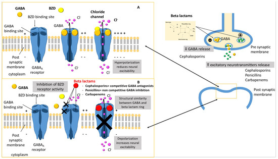 - A decrease in gamma-aminobutyric acid (GABA) neuroinhibitory tone through the concentration-dependent inhibition of subunits of the GABAA receptor complex in a competitive (cephalosporins) or non-competitive (penicillins) way. Indeed, the activation of GABAA receptor by endogenous GABA results in an intracellular influx of chloride ions, creating an inhibitory postsynaptic potential that increases the threshold for the generation of an action potential.