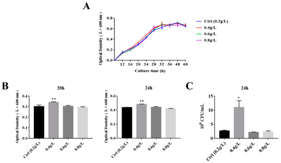 Effects of 0.2, 0.4, 0.6, and 0.8 g/L of tryptophan on growth of A. muciniphila BAA-835T. (A) The growth curve of A. muciniphila BAA-835T grew with different concentrations of tryptophan. (B) Optical density of A. muciniphila BAA-835T at 20 and 24 h. (C) CFU/mL of A. muciniphila BAA-835T at 24 h. One-way ANOVA with a post hoc Dunnett test was used to determine statistical differences, compared with the Ctrl group. * p < 0.05, ** p < 0.01.