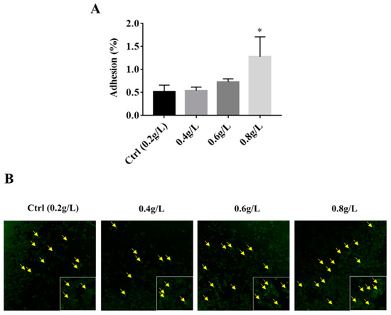 Effects of 0.2, 0.4, 0.6, and 0.8 g/L of tryptophan on adhesion of A. muciniphila BAA-835T. (A) Adhesion to HT-29, and (B) CFDA-SE-labeled A. muciniphila BAA-835T adhere to HT-29. One-way ANOVA with a post hoc Dunnett test was used to determine statistical differences, compared with the Ctrl group. * p < 0.05.