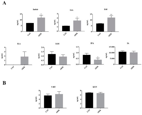 The concentrations of tryptophan metabolites in supernatant of A. muciniphila BAA-835T. (A) Indole and its derivatives. (B) 5-HT and KYN. Student’s t-test was used to determine statistical differences, compared with the Ctrl group. * p < 0.05, ** p < 0.01.