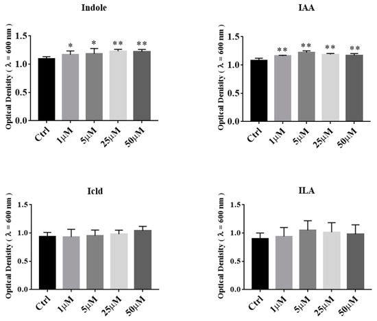Effects of tryptophan metabolites produced by A. muciniphila on growth of A. muciniphila BAA-835T. One-way ANOVA with a post hoc Dunnett test was used to determine statistical differences, compared with the Ctrl group. * p < 0.05, ** p < 0.01.