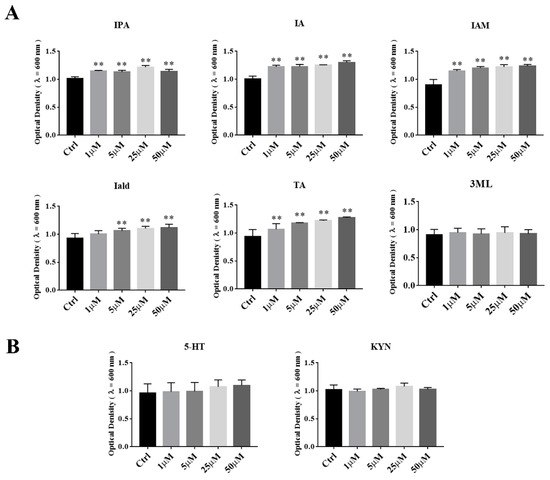 Effects of tryptophan metabolites produced by other gut microbiota on growth of A. muciniphila BAA-835T. (A) Indole and indole derivatives produced by gut microbiota. (B) 5-HT and KYN. One-way ANOVA with a post hoc Dunnett test was used to determine statistical differences, compared with the Ctrl group. ** p < 0.01.
