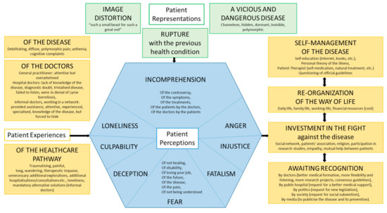 The illness caused multiple feelings perceived by the patients: incomprehension, fear, isolation, guilt, disappointment, anger, injustice, and doom. The patients had a representation of a vicious and dangerous disease, responsible for a rupture with the previous state of health. The experience of the illness was painfully experienced with the problem of non-specific, unpredictable, and severe symptoms. Patients reported difficulty for physicians in interpreting their symptoms and a lack of listening and recognition, responsible for a difficult care path. The diagnostic announcement was viewed as a recognition of the reality of their symptoms. This experience of illness, of the physician–patient relationship, and of the care path was the driver of the empowerment of the patients: self-management of their disease, re-organisation of their way of life, and involvement in the fight against their disease. Patients wished for changes such as better and attentive listening, recognition, better medical and societal management, and improved knowledge on Lyme borreliosis and persistent symptoms.