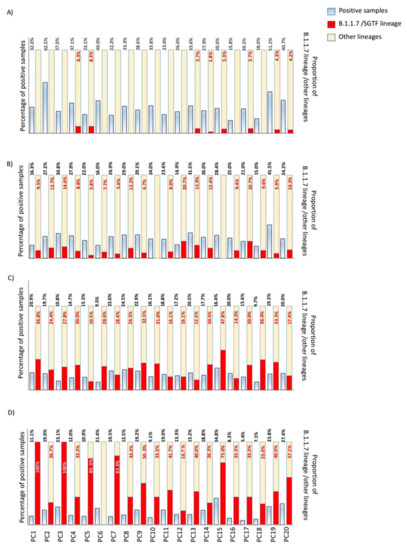 - Frampton, D.; Rampling, T.; Cross, A. Genomic characteristics and clinical effect of the emergent SARS-CoV-2 B.1.1.7 lineage in London, UK: A whole-genome sequencing and hospital-based cohort study. Lancet Infect. Dis. 2021. [Google Scholar] [CrossRef]