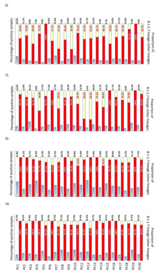 Temporal evolution in the incidence of B.1.1.7 (Alpha variant) in our health area: (A) first biweekly period (2–17 January); (B) second biweekly period (18–31 January); (C) third biweekly period (1–14 February); (D) fourth biweekly period (15–28 February); (E) fifth biweekly period (1–14 March); (F) sixth biweekly period (15–28 March); (G) seventh biweekly period (29 March–11 April); (H) eighth biweekly period (12–22 April). All dates correspond to 2021. PC: primary care.