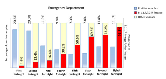 At the end of the first month, this variant was present in practically all health areas. In the successive two biweekly periods, the B.1.1.7/SGTF was suspected in all centers, and the prevalence continued growing from 27.3 to 46.3% in February (Figure 1c–d). It is important to highlight as in that moment, the proportion of the B.1.1.7/SGTF was higher than 75% in five PC centers. In the next 2 months, this variant reached 75.1% and 92.7% in March and April respectively (Figure 1e–h), although in the last 2 weeks the replacement reached a plateau. According to these data, the variant belonging to B.1.1.7/SGTF showed a linear increase (R > 0.99) with a viral replacement rate of around 30% during the described period. The shift speed was practically constant along the studied period. A similar replacement was observed in the emergency department during the study period, growing from 4.6 to 91.3% from the first to the eighth biweekly period (Figure 2). The viral replacement rate was similar in the emergency department (R > 0.99), although the shift replacement was slightly higher between 2 and 3 months (reaching a replacement speed around 36%). To confirm our initial classification, 38 samples yielding positive amplification for SARS-CoV-2 and an amplification pattern suggestive of B.1.1.7 lineage were sequenced. All of them were correctly assigned to the B.1.1.7 lineage, and accession numbers are available in Table S1.