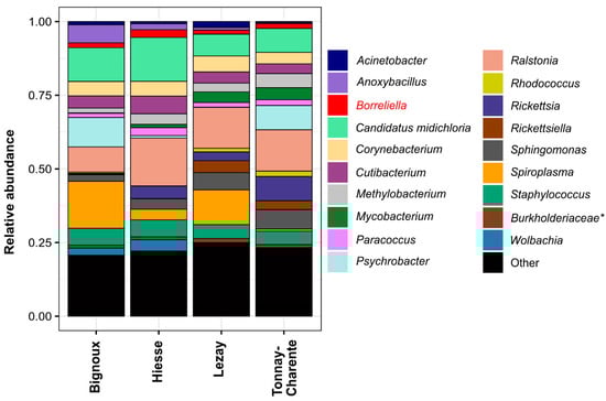 Relative abundance bar plot of the 20 most commonly detected taxonomic units grouped by sampling site. Taxa were classified at the genus level whenever possible. Each column represents grouped samples from a sampling site. Genera were represented depending on the overall reads number. The category « other » contains all taxa that do not belong to the 20 most abundant. Borreliella is in red because a focus on this genus is made later in the article. *: Assignment at the family level only because it was not feasible to have a more detailed assignment.