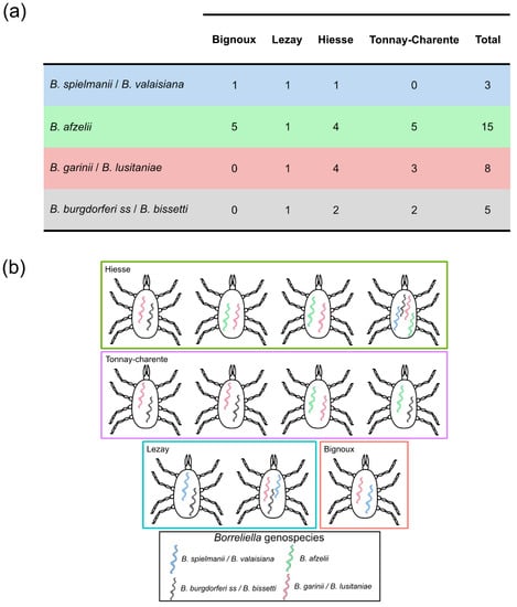The presence of Borreliella in I. ricinus nymphs at the individual level. (a) The number of samples infected by Borreliella genospecies for each sampling site. A sample was considered positive if at least 10 reads for a genospecies were detected. Positive samples presented here can be co-infected by two or more genospecies; (b). Schematic representation of the different Borrelellia clusters found within the same infected nymph.