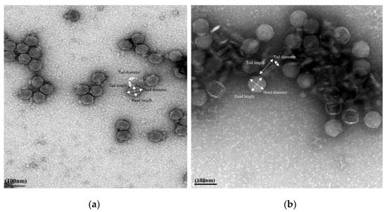 Transmission electron microscopy image of phage morphology (a) Ro103C3lw with a capsid (61.1 ± 0.5 nm in diameter and 58.8 ± 0.5 nm in length) and a short tail (17.0 ± 0.5 nm in length and 23.5 ± 0.5 nm in diameter), showing Podoviridae morphology. (b) Pr103Blw with a capsid (75.0 ± 0.5 nm in diameter and 73.6 ± 0.5 nm in length) and a long contractile tail (118.8 ± 0.5 nm in length and 21.0 ± 0.5 nm in diameter), showing Myoviridae morphology.