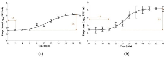 One-step growth curve of the phage Ro103C3lw (a) and Pr103Blw (b) using E. coli O103:H2 strain (RM10744). The growth parameters of the phage indicate a latent period (LP) and an average burst size (BS) of each phage. The error bars present the standard error of the mean for each time point of the one-step growth curve.