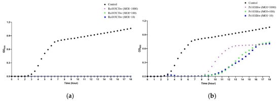 The bacterial challenge assay was performed to measure bacterial growth treated with different MOIs of phages, as previously described, with minor changes []. Bacterial cultures of E. coli O103:H2 strains (RM13322 and RM10744) were prepared and diluted to the concentration of 1 × 106 CFU/mL. Two bacterial cultures were mixed as the bacterial cocktail for the bacterial challenge assay. A measure of 200 µL of the bacterial cocktail per well was added into a 96-well plate; then, 10 µL of individual phage (Ro103C3lw or Pr103Blw) was added to each well containing the bacterial cocktail to reach MOIs of 10, 100, and 1000, accordingly. The plate was placed in a spectrophotometer (BioTek, Winooski, WT, USA) at 37 °C, and the OD600 reading was measured every 30 min for 18 h.