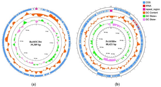 Circular genome maps of phage Ro103C3lw (a) and Pr103Blw (b) using CGview serverBETA. The rings from inside out represent GC skew (green and light purple), GC content (orange), CDSs (blue), and repeat region (velvet). tRNAs (red) are only detected in phage Ro103Blw (b). The predicted functions of the annotated CDSs are listed in Tables S1 and S2.