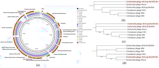 The blastn result showed that Ro103C3lw had the highest nucleotide sequence similarity (87.78% identity and 86% coverage) to Cronobacter phage GW1. In addition, the Ro103C3lw genome also shared a minimum of both 85% nucleotide identity and coverage with the genomes of Citrobacter phage SH4, Citrobacter phage SH5, Escherichia phage Pisces, and Escherichia phage vB_EcoP-Ro45lw. The Bacterial and Archaeal Viruses Subcommittee (BAVS) of the International Committee on Taxonomy of Viruses (ICTV) indicates that the threshold for species-level classification is at least 95% nucleotide sequence identity based on a blastn search []. Thus, phage Ro103C3lw was taxonomically identified as a novel species belonging to the Kayfunavirus genus of Autographiviridae family (which is derived from Podoviridae family) under the order of Caudovirales. Comparative analysis showed that phage Ro103C3lw and its five closely related reference phages, as stated above, shared most of the CDSs with known function; however, two CDSs with the respective functions of host RNA polymerase inhibitor and putative tail fiber in the Ro103C3lw genome were absent in the genomes of all reference phages (Figure 5a). Furthermore, phylogenetic analyses showed that phage Ro103C3lw contained some CDSs with the predicted functions related to phage infection (tail fibers) and host cell lysis (lysin, holin, and spanin) that were genetically different from the counterparts in these five reference phages (Figure 5b,c). On the contrary, Ro103C3lw had two predicted CDSs coding for terminases, associated with phage DNA packaging, showing a close evolutionary relationship with that of Escherichia phage Pisces (Figure 5d).