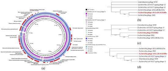 The blastn results showed that the taxonomy of myophage Pr103Blw belonged to the Felixounavirus genus under the order Caudovirales. The complete genome of phage Pr103Blw shared 97.28% nucleotide sequence identity over 95% coverage with the genome of phage Escherichia coli O157 typing phage 12. Comparative analysis showed that phage Pr103Blw contained most CDSs with the predicted functions similar to the counterparts in the five closely related reference phages (Escherichia coli O157 typing phage 12, Escherichia phage JN01, Escherichia phage vB EcoM-Ro111lw, Escherichia phage wV8, and Escherichia coli O157 typing phage 11) obtained from the NCBI database; however, one CDS associated with tail fiber was different from that of these five reference phages (Figure 6a). Phylogenetic analysis showed that phage Pr103Blw was closely related to the Escherichia phage JN01 with regard to the CDSs with the predicted function of tail fibers, which were responsible for the phage infection (Figure 6b). The CDSs of lysin and holin, both associated with hosts lysis, in the Pr103Blw genome showed a high nucleotide similarity to the counterparts in Escherichia phage JN01 and Escherichia phage vB EcoM-Ro111lw (Figure 6c). Furthermore, phage Pr103Blw contained the CDS of terminase, sharing high nucleotide sequence similarity with Escherichia coli O157 typing phage 12, Escherichia phage wV8, and Escherichia coli O157 typing phage 11 (Figure 6d).