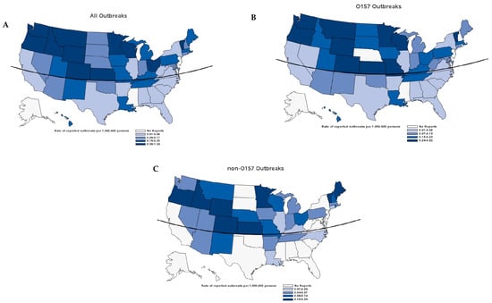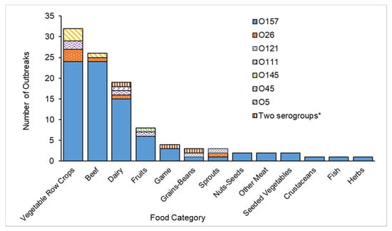 - Centers for Disease Control and Prevention (CDC). National Shiga Toxin-Producing Escherichia coli (STEC) Surveillance Annual Report, 2016; US Department of Health and Human Services, CDC: Atlanta, GA, USA, 2018. [Google Scholar]