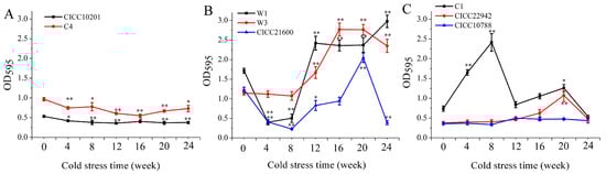 Biofilm formation of S. aureus cells after cold stress at −20 °C. Note: (A): Biofilm formation of S. aureus CICC 10201 and C4. (B): Biofilm formation of S. aureus W1, W3 and CICC 21600. (C): Biofilm formation of S. aureus C1, CICC 22942 and CICC 10788. Strains without cold stress were used as control samples, and strains after cold stress at −20 °C for 4 weeks, 8 weeks, 12 weeks, 16 weeks, 20 weeks, or 24 weeks were used as the treatment groups. **: Compared with the control groups, the tested sample were significantly different (p < 0.01), *: Compared with the control group, the treated sample were different (p < 0.05). The values were means ± standard deviations (SD, n = 8).