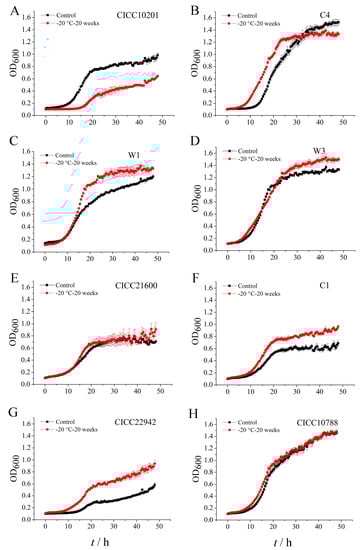 The growth of S. aureus biofilm cells after cold stress at −20 °C for 20 weeks. Note: The growth curve of biofilm cells of S. aureus CICC 10201 (A), S. aureus C4 (B), S. aureus W1(C), S. aureus W3 (D), S. aureus CICC 21600 (E), S. aureus C1 (F), S. aureus CICC 22942 (G) and S. aureus CICC 10788 (H) was represented by the OD value at 600 nm. The biofilm cells of S. aureus strains without cold stress were used as control groups. The biofilm cells of S. aureus strains after cold stress at −20 °C for 20 weeks were used as treatment groups.