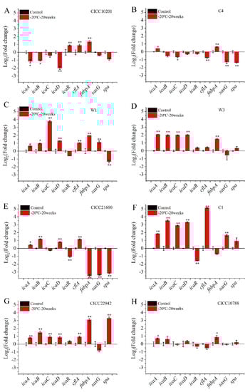 The transcription levels of genes in S. aureus biofilm cells with cold stress. Note: The transcription levels of genes in biofilm cells of S. aureus CICC 10201 (A), S. aureus C4 (B), S. aureus W1 (C), S. aureus W3 (D), S. aureus CICC 21600 (E), S. aureus C1 (F), S. aureus CICC 22942(G), S. aureus CICC 10788 (H) was measured by Real-Time PCR. S. aureus without cold stress was used as the control group. The gene transcription levels in biofilm cells of S. aureus after cold stress for 20 weeks at −20 °C were tested. The polysaccharide intercellular adhesin (PIA) is mainly regulated by icaABCDR genes gene. The adhesion proteins included sasG, cflA, spa, or fnbpA genes. **: Compared with the control group, the tested sample was significantly different (p < 0.01), *: Compared with the control group, the treated sample was different (p < 0.05). The values were means ± SD (n = 3).