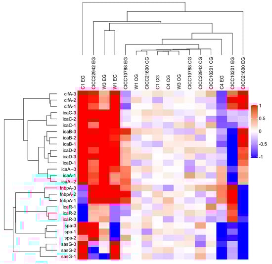 Heat map of the transcription levels of genes in the S. aureus biofilm cells under cold stress. Note: S. aureus without cold stress was used as the control group. The gene transcription levels in biofilm cells of S. aureus after cold stress for 20 weeks at −20 °C were tested. Meanwhile, EG indicated the experimental group, and CE was the control group. The red square indicated that the transcription levels of genes were obviously increased. The blue square indicated significantly decreased gene transcription.