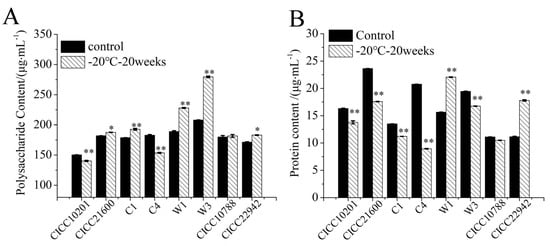 A BCA kit was used to quantitatively detect the protein content in the biofilm matrix of S. aureus after cold stress (Figure 5B). The strains without cold stress were used as the control groups. Compared to the controls, the protein contents of S. aureus W1 and CICC 22942 were significantly increased after 20 weeks of cold stress at −20 °C (p < 0.01). However, that of strains CICC 10201, CICC 21600, C1, C4, and W3 after cold stress decreased significantly (p < 0.01). There was no difference in S. aureus CICC 10788 cells with or without cold stress, and the total protein content was far lower than the polysaccharide content.