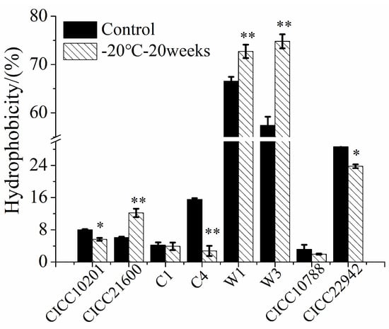 Hydrophobicity of S. aureus strains after cold stress. Note: The S. aureus CICC 10201, CICC 21600, CICC 22942, CICC 10788, W3, W1, C1 and C4 with cold stress were the test groups, and strains without cold stress were used as the control samples. *: Compared with the control group, the treated samples were different (p < 0.05). **: Compared with the control group, the tested sample were significantly different (p < 0.01). The values were means ± SD (n = 3).