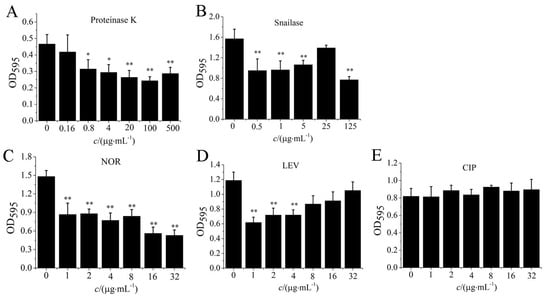 Different concentrations of norfloxacin (NOR), levofloxacin (LEV), ciprofloxacin (CIP), proteinase K, and snailase were used to remove biofilm of S. aureus W3 cells. When the concentration of proteinase K was higher than 20 µg/mL, the S. aureus biofilm could be effectively eliminated (p < 0.01, Figure 7A). And the biofilms of S. aureus W3 cells could also be effectively degraded by the 125 µg/mL snailase (p < 0.01, Figure 7B). In addition, the biofilms of S. aureus W3 strains were removed effectively through different concentrations of NOR (p < 0.01), and the biofilm content was reduced 62% by the 16 µg/mL concentration of antibiotics NOR (Figure 7C). Similarly, biofilms of S. aureus W3 cells could also be removed by antibiotics LEV in the 1–8 µg/mL range of concentration (p < 0.05, Figure 7D). The efficiency of LEV to remove biofilm was lower than 47%. By contrast, CIP treatment had no effect on biofilm clearance (Figure 7E).