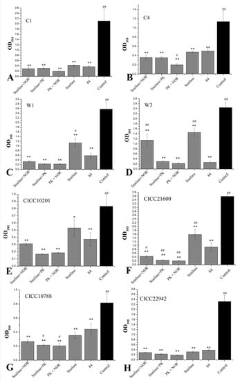 Bacterial biofilm formation by S. aureus CICC 10201, CICC 21600, CICC 22942, CICC 10788, W3, W1, C1, or C4 cells was measured using the 96-well plate crystal violet staining method [,]. Briefly, every sample (106 CFU/mL) was added to 96-well microtiter plates at 200 µL per well and repeated in 6 wells. After incubation at 37 °C for 24 h, the culture medium was discarded. Then snailase and norfloxacin mixture (125 µg/mL + 16 µg/mL), snailase and proteinase K mixture (125 µg/mL + 20 µg/mL), NOR and proteinase K mixture (16 µg/mL + 20 µg/mL), snailase (125 µg/mL) and 84 disinfectant (disinfectant with sodium hypochlorite, 1%) were added into the wells respectively, incubated for 1 h. Then, these solutions were discarded, and biofilms were washed twice by water. Finally, OD595 values of crystal violet retention were measured to determine the extent of biofilm removal.