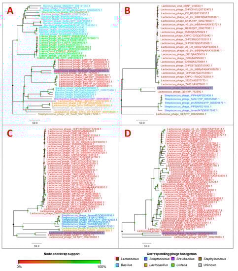 Neighbor-joining (NJ) trees of the selected Nocturne116 protein amino acid sequences and similar sequences found in the proteomes of other phages. The trees are drawn to scale and branch lengths correspond to the number of amino acid differences. For each ClustalW-generated [33] multiple sequence alignment used to build the NJ trees [34], all positions with less than 90% site coverage were eliminated (less than 10% alignment gaps, missing data, and ambiguous bases were allowed at any position). (A) putative DNA polymerase (51 sequences with 393 aa positions in the final dataset; the optimal tree with the sum of branch lengths = 2245.23899841 is shown); (B) major capsid protein (30 sequences with 394 aa positions in the final dataset; the optimal tree with the sum of branch lengths = 836.47900391 is shown); (C) terminase (51 sequences with 507 aa positions in the final dataset; the optimal tree with the sum of branch lengths = 1099.23297322 is shown); (D) tail tape measure (54 sequences with 619 aa positions in the final dataset; the optimal tree with the sum of branch lengths = 11,555.21886359 is shown). In all of the trees: tips are labeled as “Phage|respective protein accession” and labels are colored based on the host genera of a phage from the proteome of which the respective sequence was retrieved according to the legend; label of the leaf containing the amino acid sequence of Nocturne116 is highlighted in blue; nodes are colored based on the percentage of their bootstrap support (inferred from 1000 bootstrap test replicates [35]) in gradient from red (low) to green (high) according to the legend. Evolutionary analyses were conducted in MEGA7 [36] and the resulting trees were drawn in FigTree v1.4.4 [37].