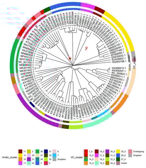 - Moraru, C.; Varsani, A.; Kropinski, A.M. VIRIDIC — A Novel Tool to Calculate the Intergenomic Similarities of. Viruses 2020, 12, 1268. [Google Scholar] [CrossRef]